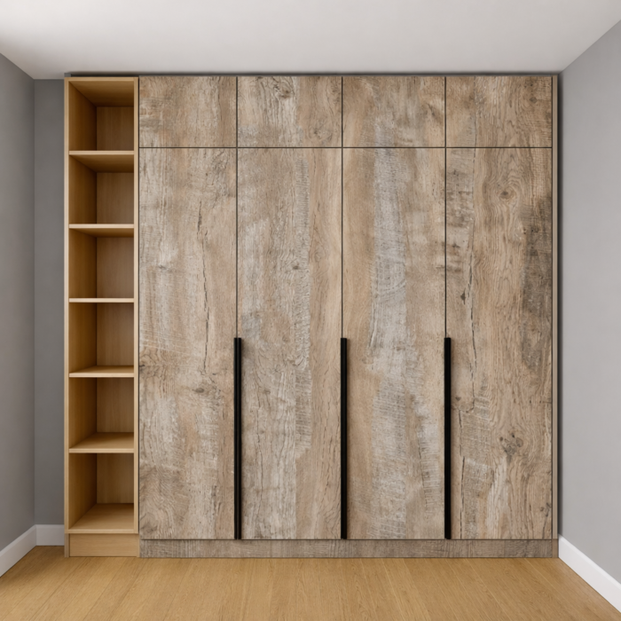 Шафа простора та функціональна, ідеальна для зберігання одягу, постільної білизни та інших домашніх предметів. Ця модель має чотири двері з додатковими полицями та штангами для вішалок всередині, що забезпечує велику місткість і відмінну організацію простору. Сучасний дизайн шафи вписується у будь-який інтер’єр, зробивши її естетично привабливим та практичним вибором для будь-якого дому.