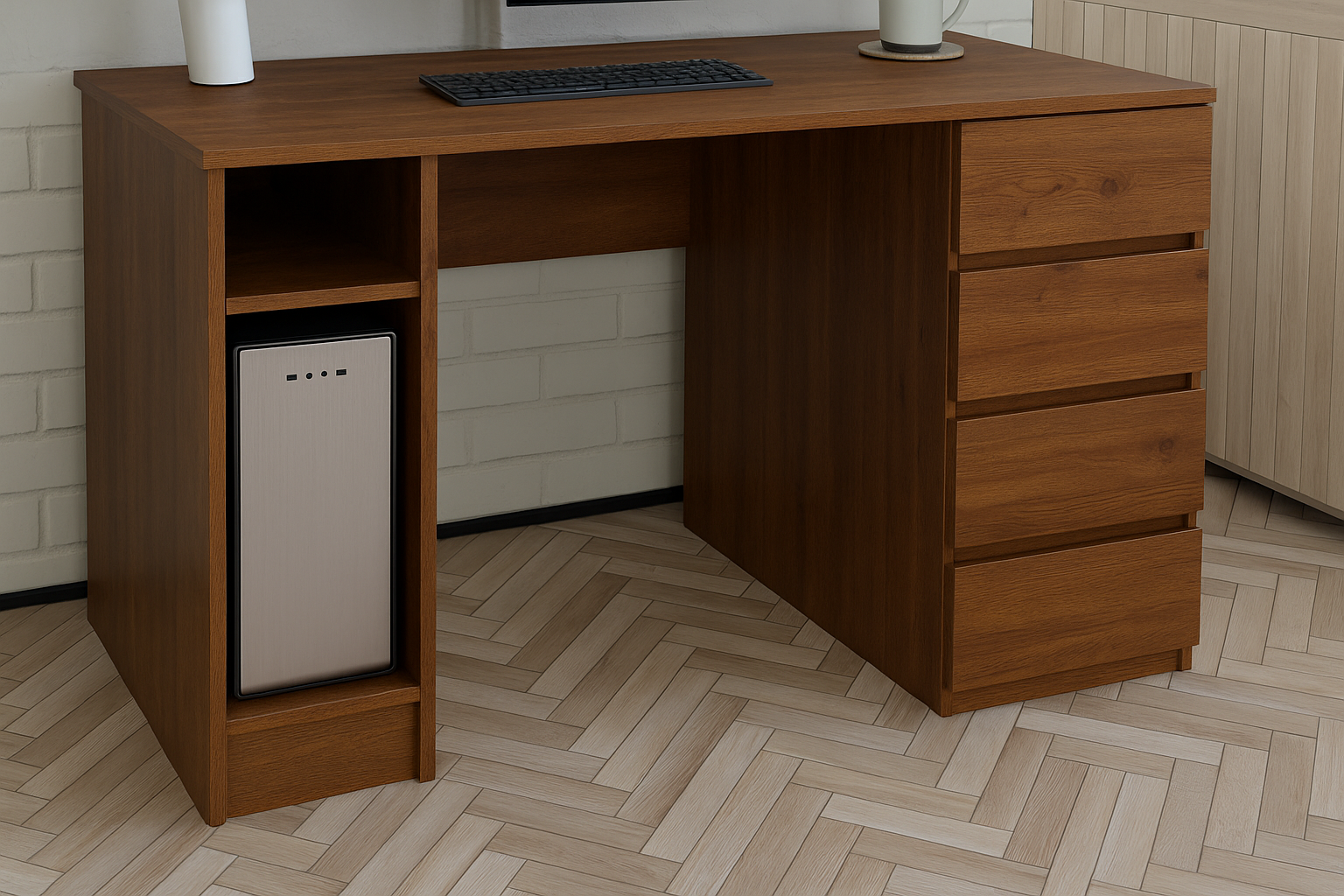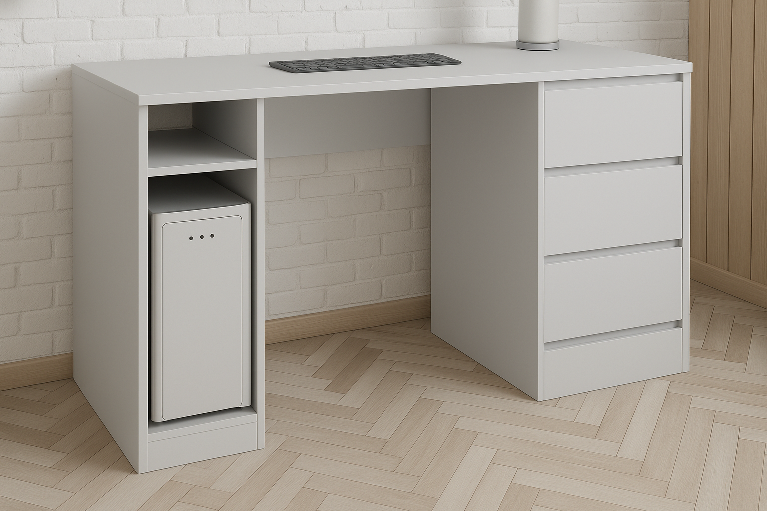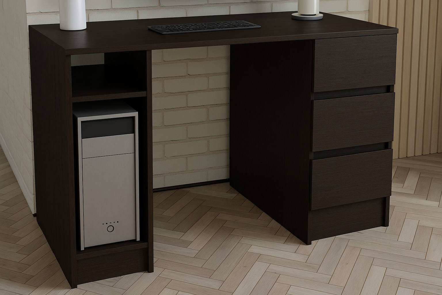 Письмовий стіл займає центральне місце у оформленні робочої зони. Він може розташовуватись у домашньому офісі, на роботі, у дитячій кімнаті у виділеній робочій зоні, у бібліотеці та просторому кабінеті. Стіл підійде для робочого місця та зберігання безлічі дрібниць. У шафку можна прибрати письмове приладдя та дрібні предмети.